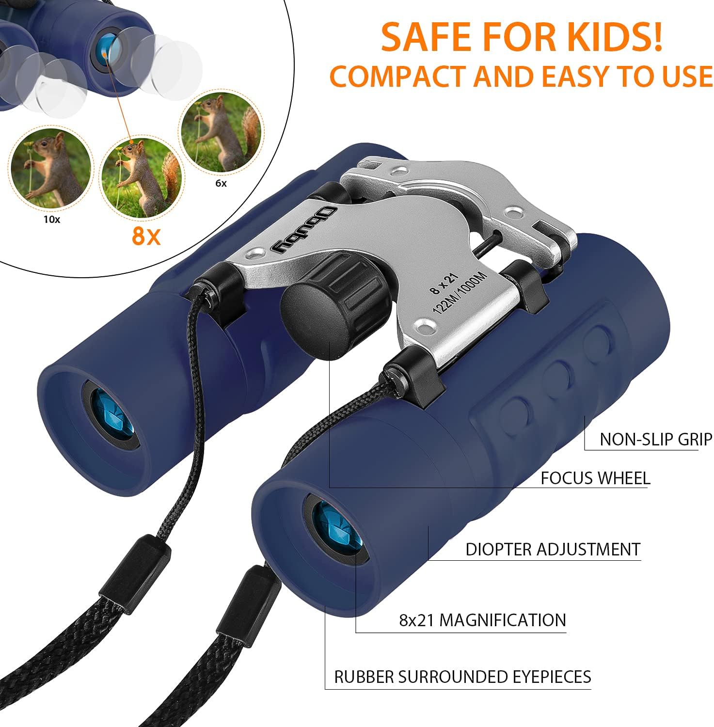 - ☆Professional Real Binoculars: Easy to focus, the leaves of a tree 122ft/1000 yards away came into sharp focus. The compact binocular can be adjusted by turning the center knob to easily match the eye distance gap for each child.