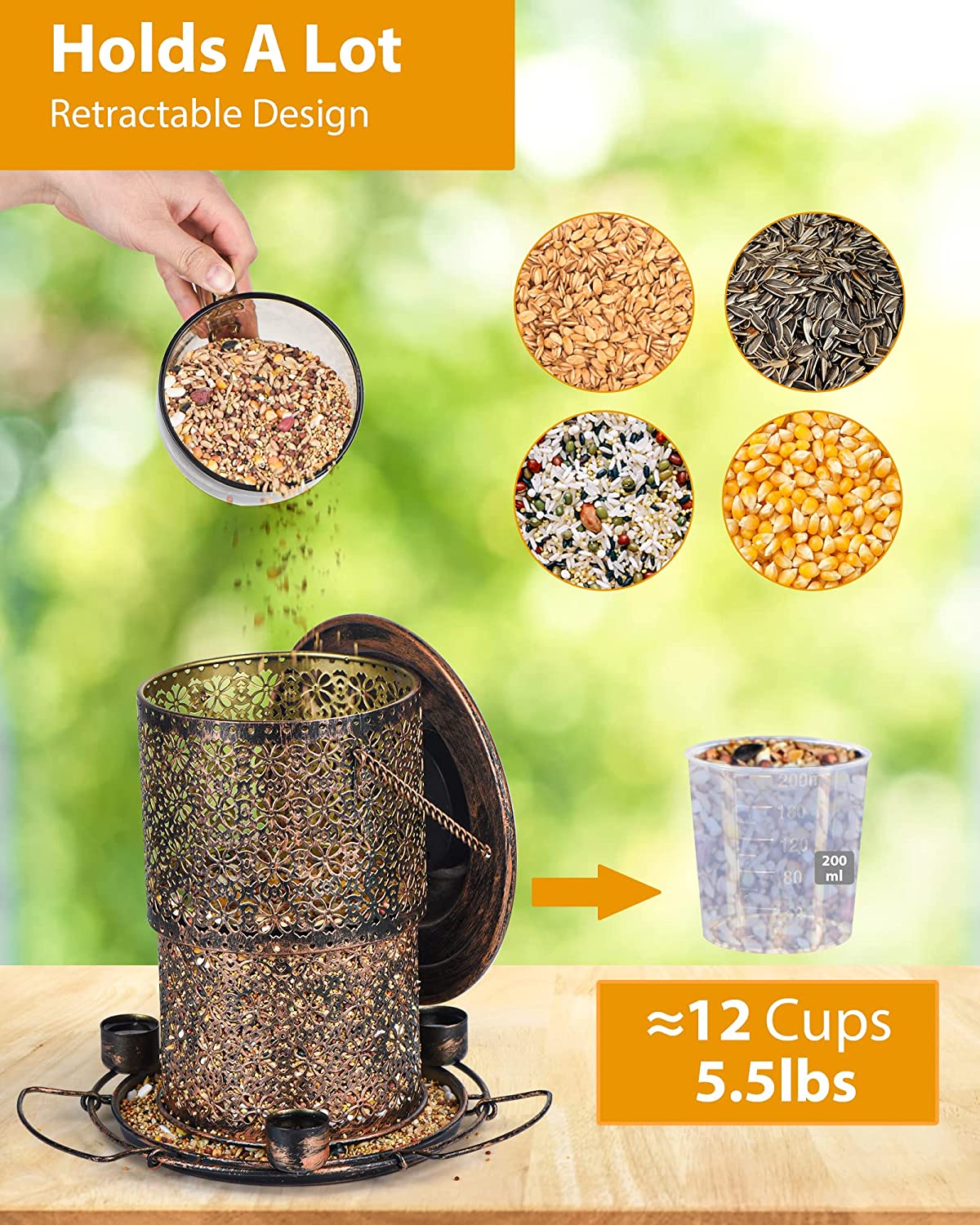 • 🦜[Easy To Refill & Clean] Our wild bird feeder is easy to refill and can be extended up and down. Simply extend up the bird feeder and fix it to fill with food. The hollow pattern design makes it convenient for you to take a look and see what the remaining level of food is, and when to refill. Meanwhile, it is easy to clean by flushing with water then drying out.